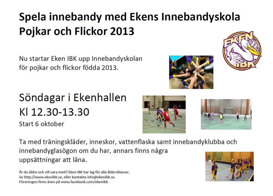 Söndag den 6 oktober startar innebandyskolan för flickor och pojkar födda 2013. Välkomna alla nya spelare! Ekenhallen kl 12.30-13.30 Ta med träningskläder, inneskor, vattenflaska samt innebandyklubba och innebandyglasögon om du har, annars finns några uppsättningar att låna. Kostnad: 400kr för hela säsongen Kontakt:info@ekenibk.se Eken IBK 17 sep 2019