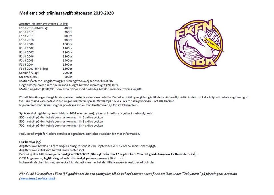 För att bli medlem och få träna i föreningens verksamhet betalar du in till föreningens bankgiro: 5370-3757 (Obs nytt från den 12 september. Men det gamla fungerar fortfarande också). . OBS! Ange namn, lagtillhörighet och fullständigt personnummer (obs! 10 siffror). Avgifter inkl medlemsavgift (100kr): Född 2013 (IB-skola): 400kr Född 2012: 700kr Född 2011: 800kr Född 2010: 900kr Född 2009: 1000kr Född 2008: 1100kr Född 2007: 1200kr Född 2006: 1300kr Född 2005: 1400kr Född 2004: 1500kr Född 2003 och äldre: 1600kr Senior / A-lag: 2000kr Stödmedlem: 100kr Motions/veteran+ungdomslag (en träning/vecka, ej seriespel): 600kr. Ungdomar/juniorer som spelar med A-laget betalar senioravgift (2000kr). Motion ungdom (FP02/03) som även tränar med andra lag betalar ordinarie träningsavgift. För att försäkringar ska gälla för spelare måste licenser vara betalda. En stor del av träningsavgiften går till detta ändamål, därför är det mycket viktigt att betala avgiften i god tid. Den måste vara betald innan någon match får spelas. Vi tillämpar också Lika för alla-principen – att alla betalar. Nya medlemmar får naturligtvis provträna innan man bestämmer sig för att bli medlem. Syskonrabatt (gäller syskon födda år 2001 eller senare), gäller ej i motionslag eller innebandyskola 300:- rabatt på den totala summan om man är 2 aktiva syskon 500:- rabatt på den totala summan om man är 3 aktiva syskon 700:- rabatt på den totala summan om man är 4 aktiva syskon När du bli blir medlem i Eken IBK godkänner du och samtycker till de policydokument som finns att läsa under ”Dokument” på föreningens hemsida (www.laget.se/ekenibk). Eken IBK 29 aug 2019