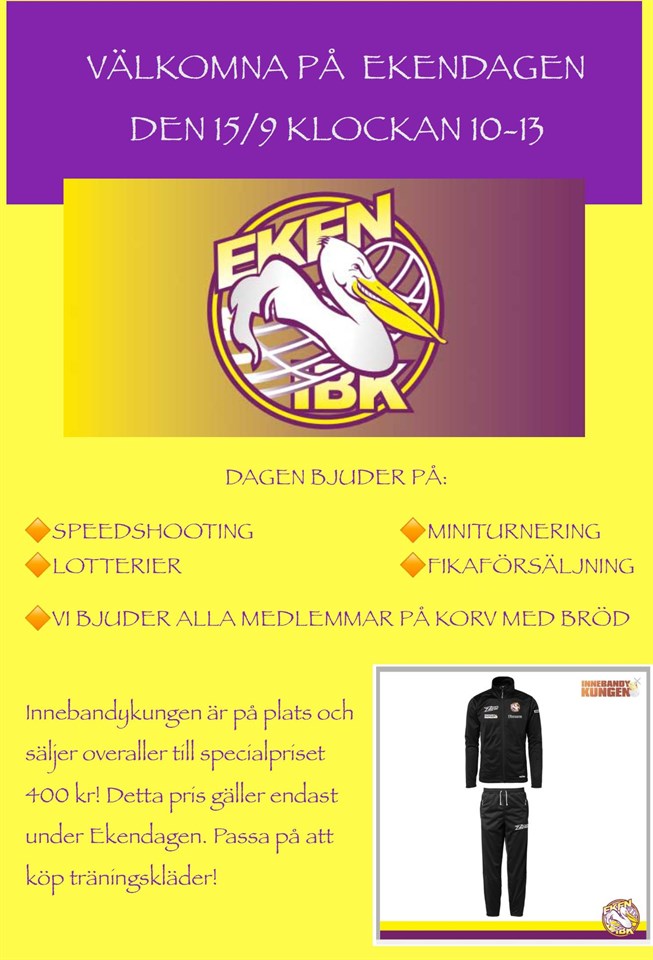 Söndag den 15 september arrangeras den årliga föreningsdagen, Ekendagen. Välkomna att vara med på trevligheter i hallen; miniturnering, speedshoting, fika och bara umgås. Innebandykungen kommer att finnas på plats med sitt innebandysortiment och våra Ekenkläder. Under dagen finns också det specialframtagna erbjudandet att köpa en Zone Gamechanger träningsoverall (junior) till kostnaden av bara 400kr (ordinarie pris 800kr med tryck, efternamn). 480kr för seniorstorlek. Obs. Endast under Ekendagen. Övriga träningskläder och väskor ur vårt Ekensortiment finns såklart till våra vanliga fina Ekenpriser. Välkomna till Ekendagen i Ekenhallen Söndagen den 15 september kl 10.00-13.00 Eken IBK 26 aug 2019