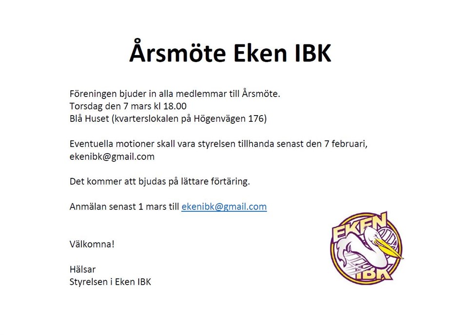 Föreningen bjuder in alla medlemmar till Årsmöte. Torsdag den 7 mars kl 18.00 Blå Huset (kvarterslokalen på Högenvägen 176) Eventuella motioner skall vara styrelsen tillhanda senast den 7 februari, ekenibk@gmail.com Det kommer att bjudas på lättare förtäring. Anmälan senast 1 mars till ekenibk@gmail.com Välkomna! Hälsar Styrelsen i Eken IBK Eken IBK 18 jan 2019 0kommentarer